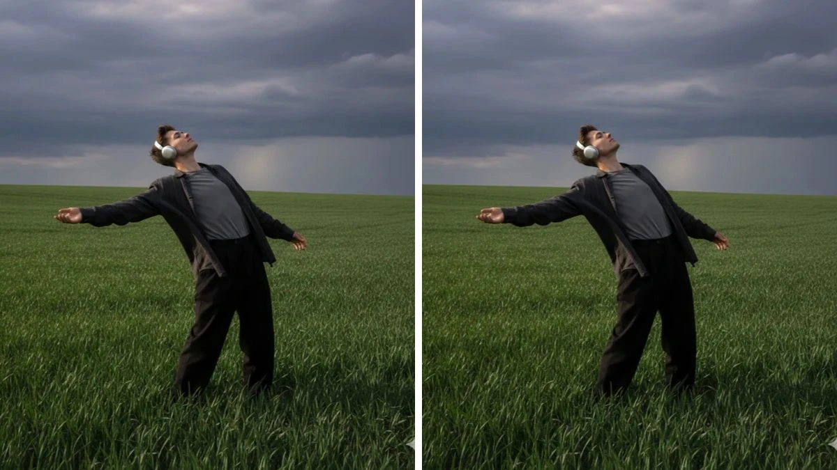 "A young man standing in a lush green field of tall grass under a dramatic overcast sky. He wears a loose, dark button-up shirt and dark trousers. His expressive posture is leaning slightly backward, with one arm outstretched and palm open, as if feeling the breeze. The camera captures him with his eyes closed, wearing large silver headphones, giving a cinematic, emotional release. The perspective is tilted, adding depth to the moody scene."