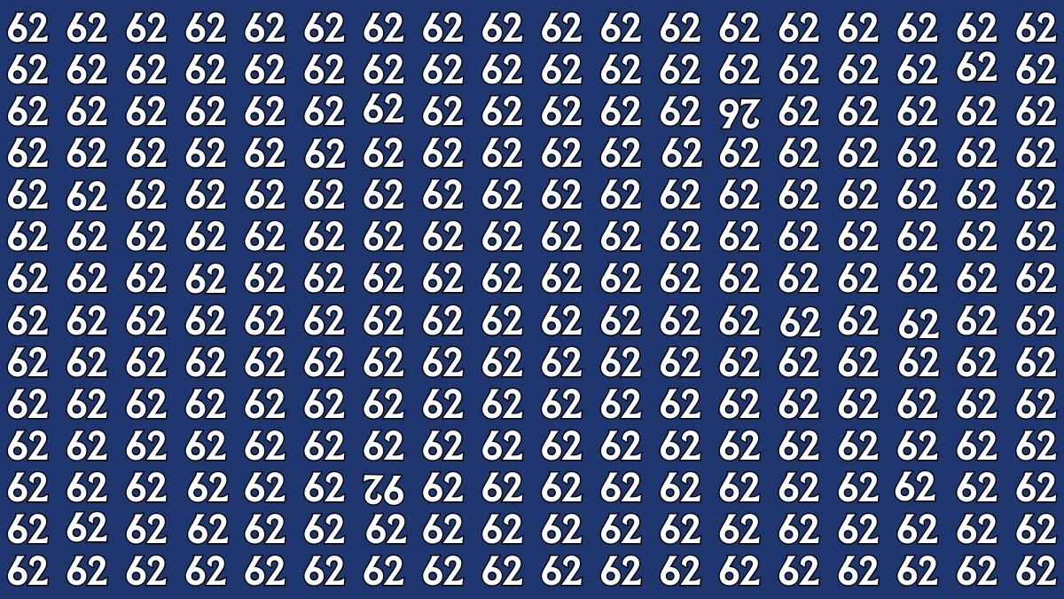 In this optical illusion filled with the number 62, the challenge is to find the two imposters a cleverly hidden inverted 26 and an inverted 92 within just seven seconds.